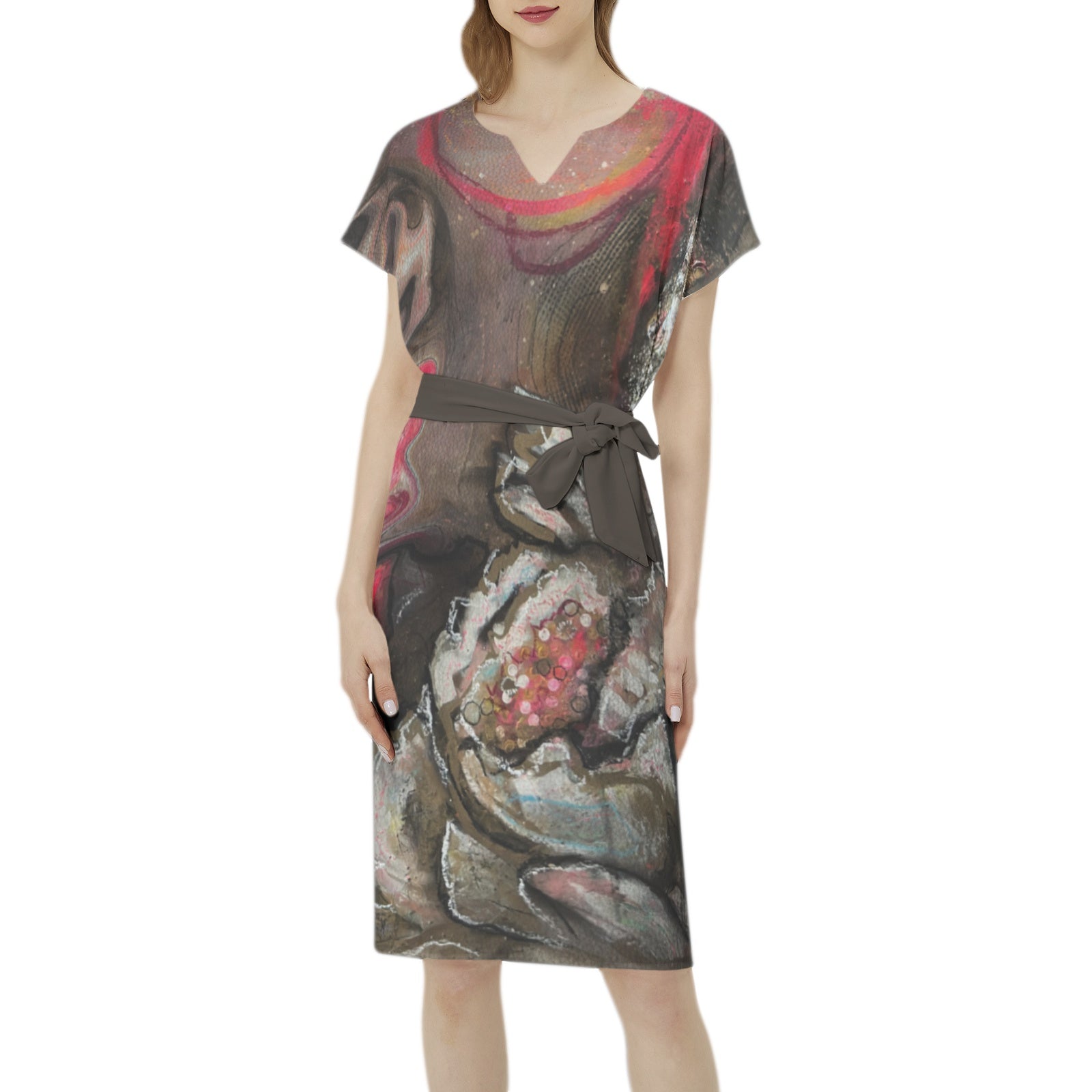 Manches chauve-souris, col cranté, ceinture à nouer à la taille, ourlet droit, tunique, robe décontractée