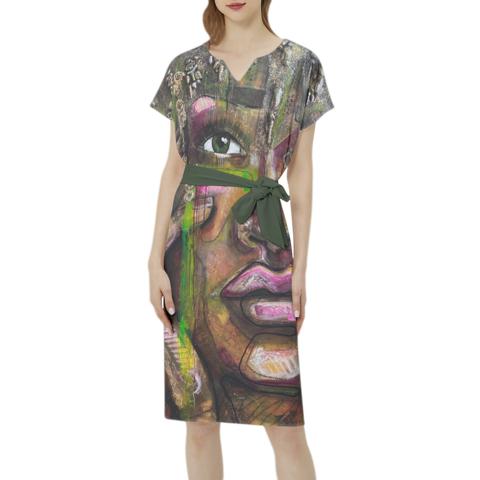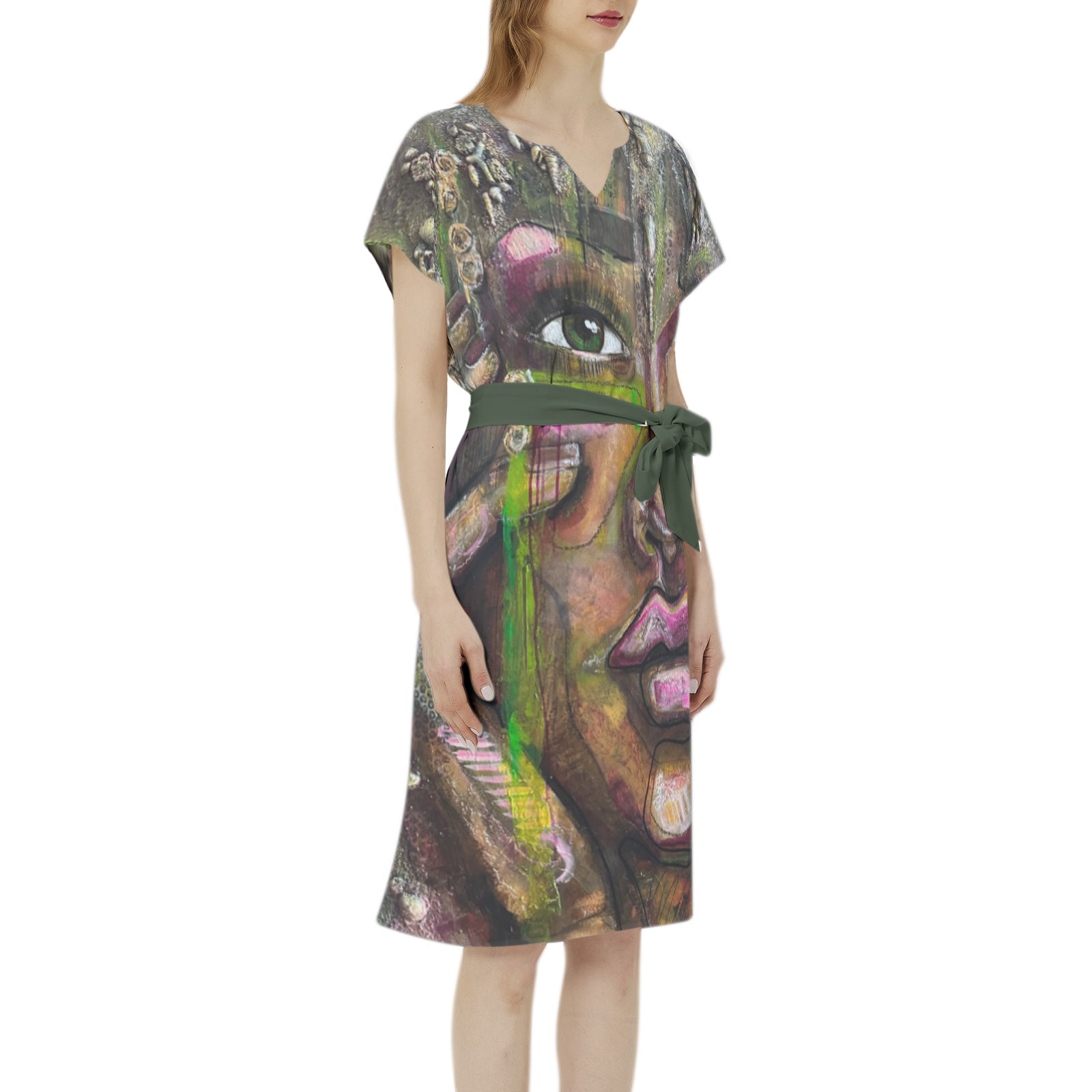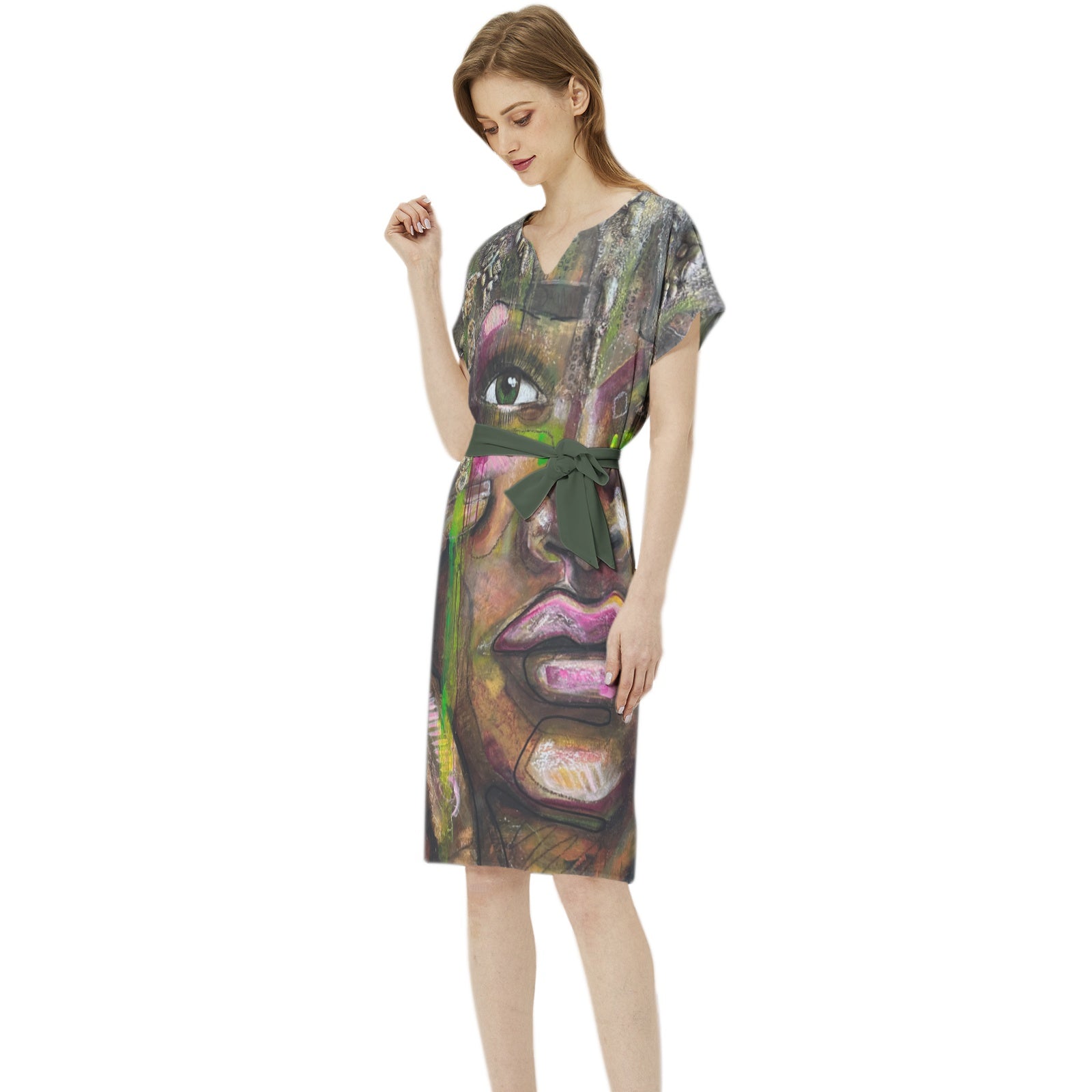 Manches chauve-souris, col cranté, ceinture à nouer à la taille, ourlet droit, tunique, robe décontractée